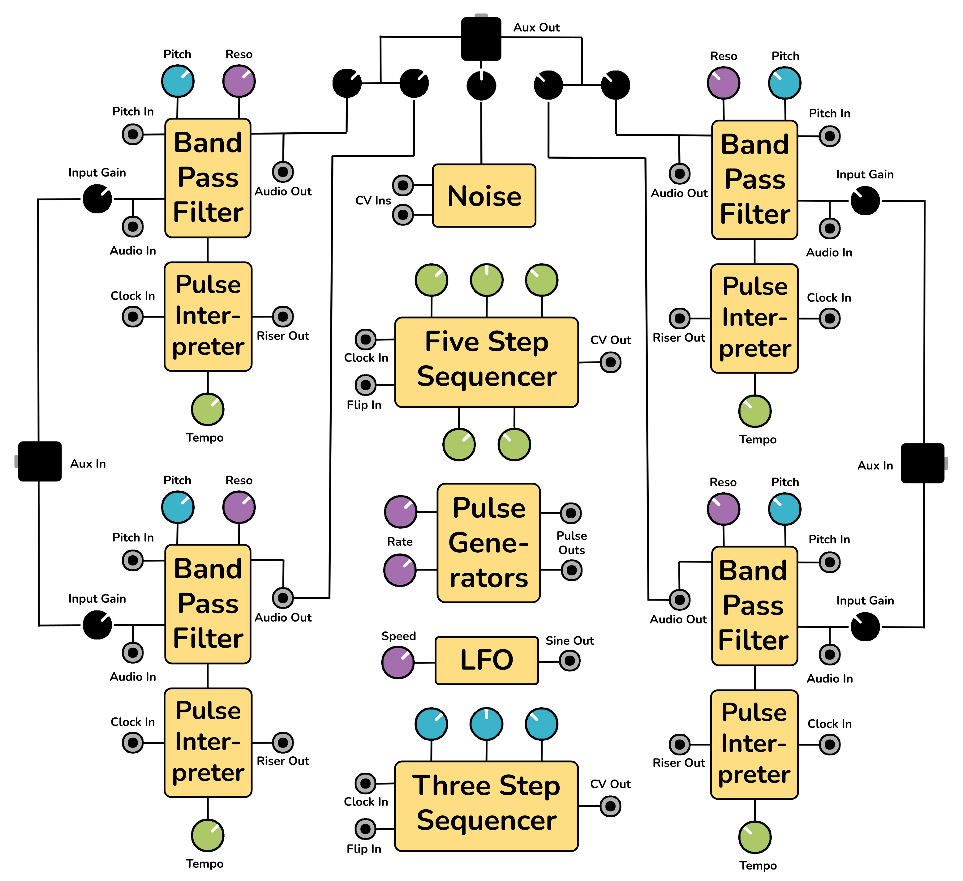 Quad Creek is a semi-modular analog sound generator and effects unit featuring four voltage-controlled band-pass filters and a variety of CV circuitry. The multi-purpose nature of the band passes allows for a variety of functions, including melodic drones, plucky percussion, wah-like audio effects, and more. Combined with a white noise module and dedicated CV circuitry, you can craft complex polyrhythmic percussive and melodic structures